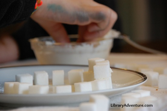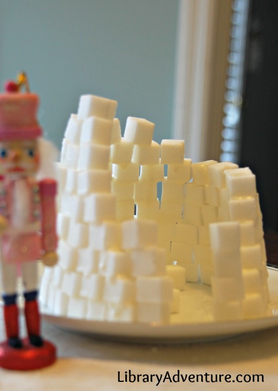 There are so many fun activities that can be done in conjunction with each of the books I mentioned. Ultimately, however, my daughter and I decided on the perfect hands-on activity for The Three Snow BearsShe thought it would be fun to make a sugar cube igloo. With a box of sugar cubes and a can of frosting, we were all set.