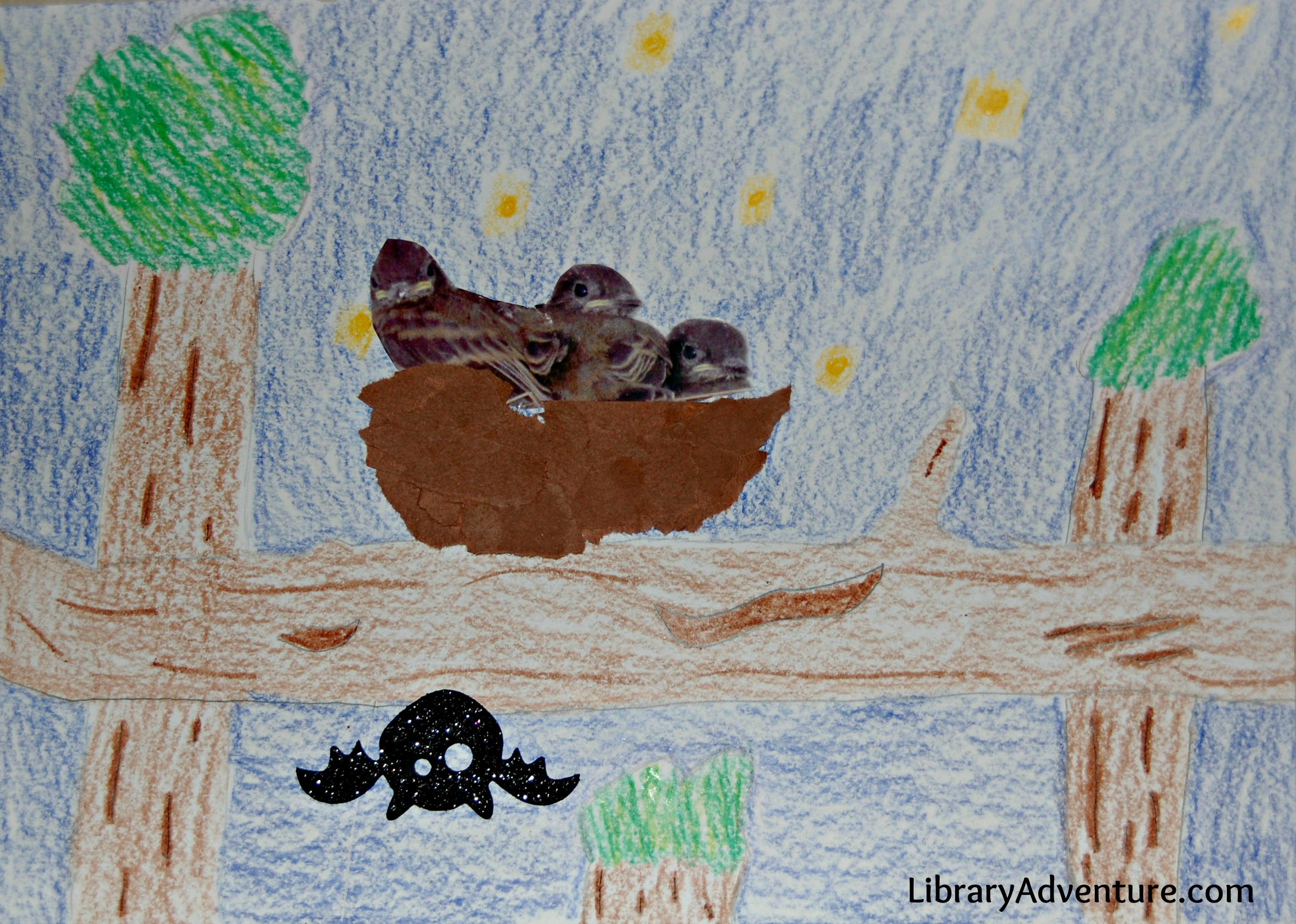I asked Emma to choose a scene to illustrate. She chose to draw some trees with a night sky in the background. She got lucky and found a great picture of a nest full of baby birds. She cut out three of these birds and glued them on one of the branches.